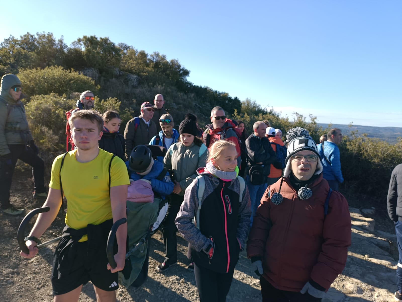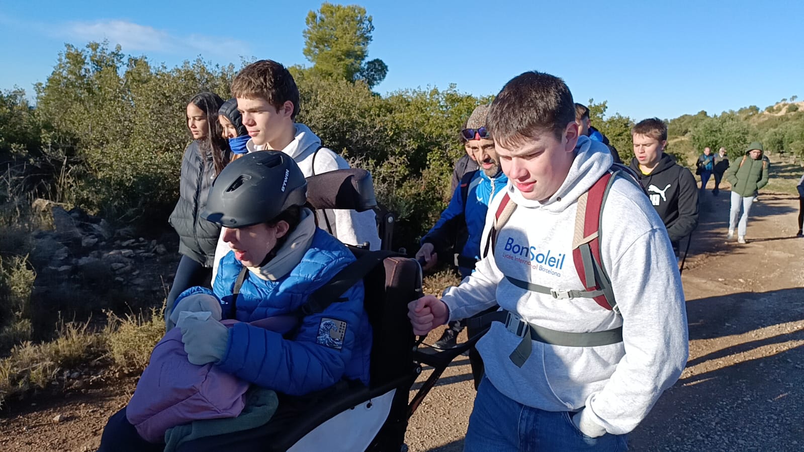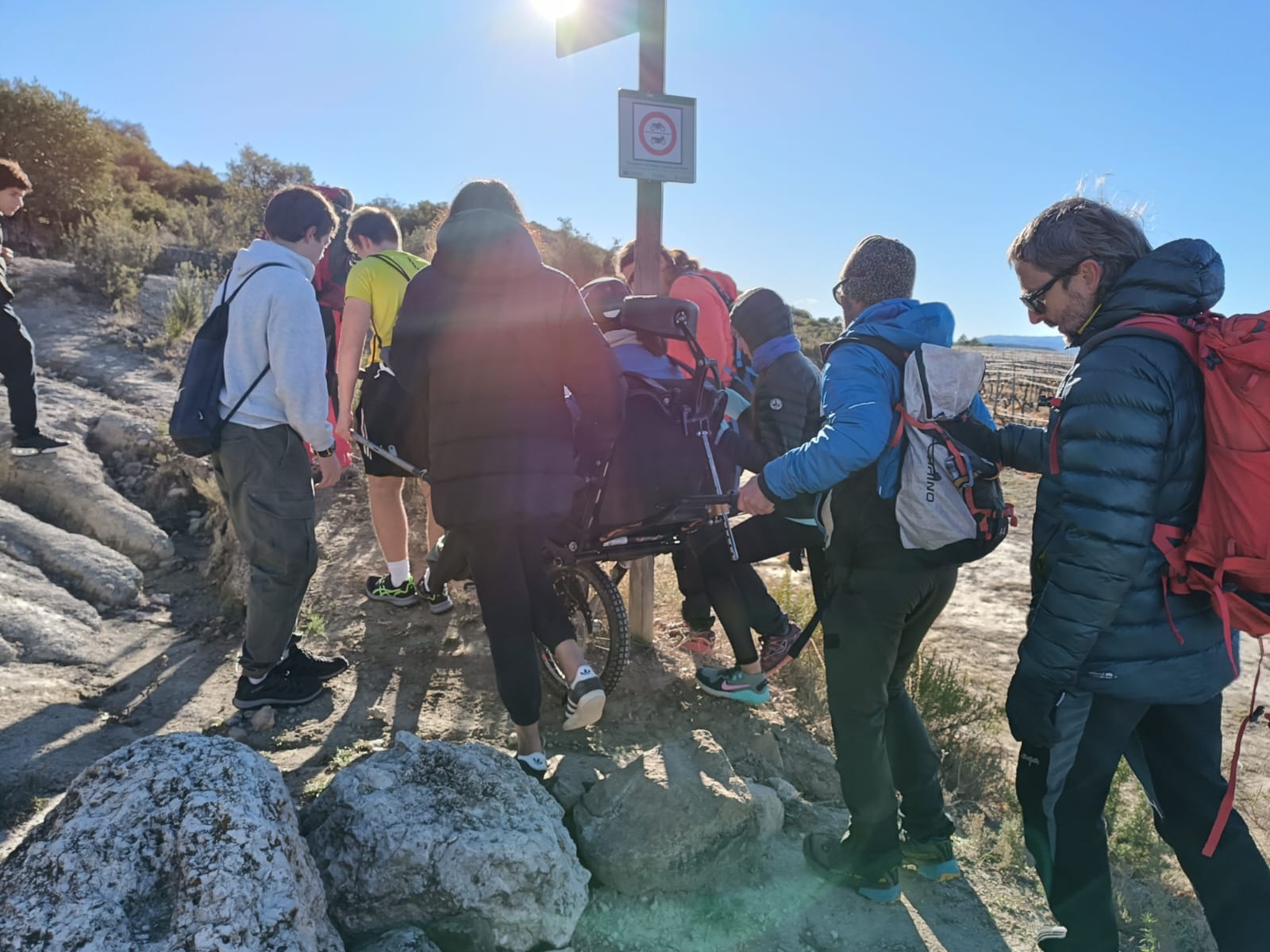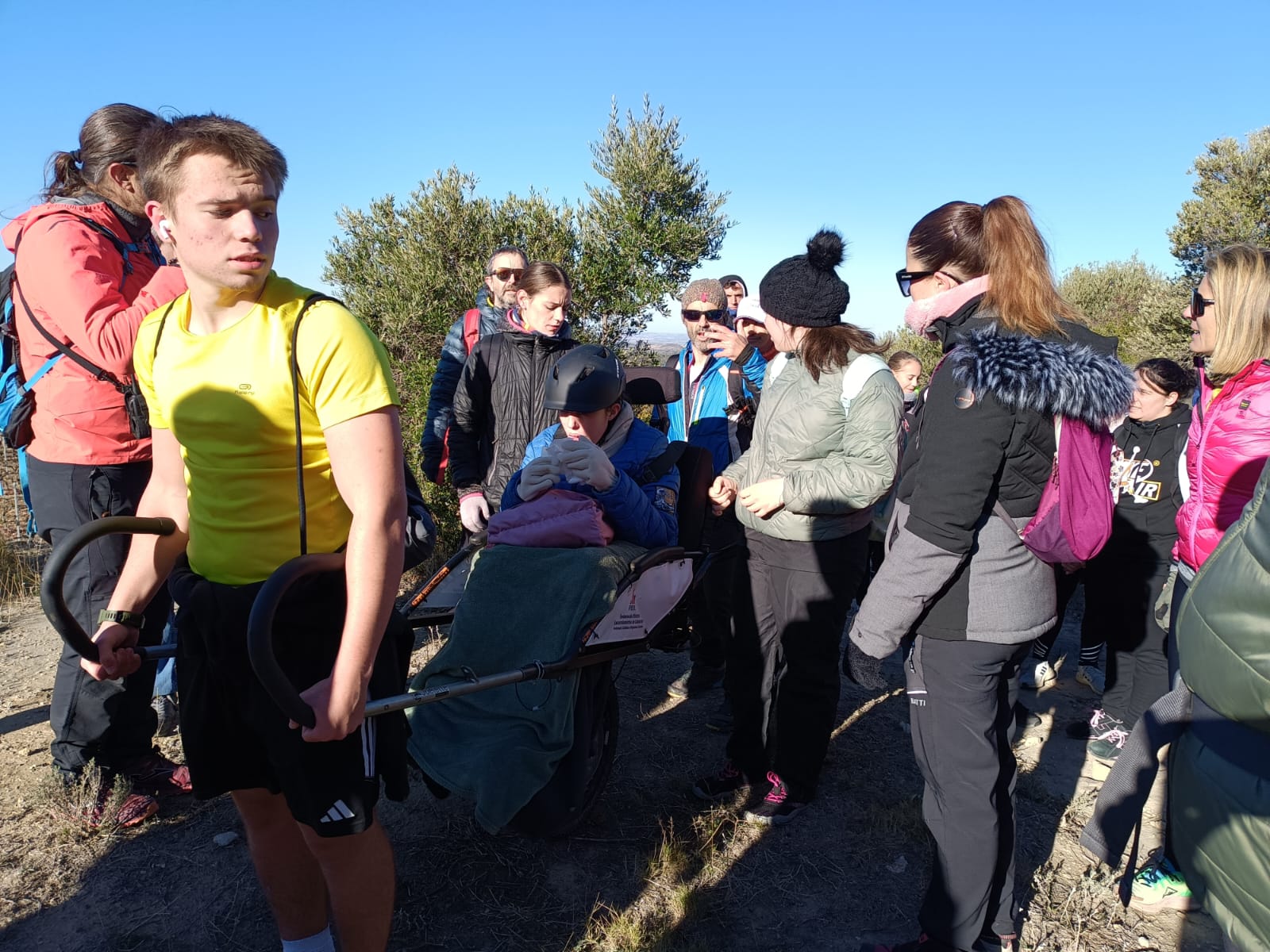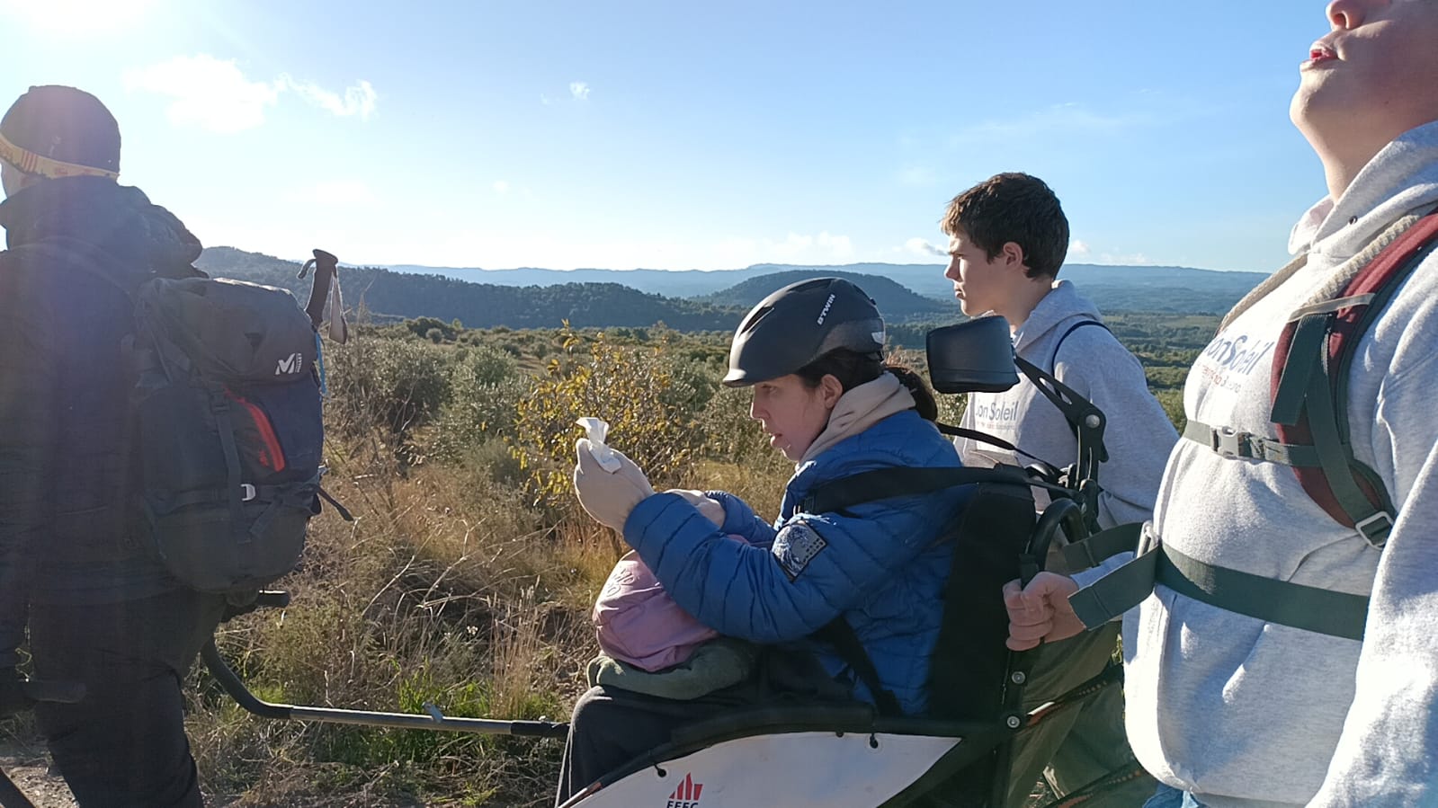 La Núria s’enfila a la cadira Joëlette que l’ha de portar fins al cim dels Bessons (593 m). Ho fa poc convençuda, amb més mandra que ganes d’emprendre aquesta sortida curta. Fa fred i vent, les temperatures han baixat i a les Borges Blanques sembla més un dia de ple hivern que no pas de tardor. Els primers metres serveixen perquè la Núria, amb més fe que no pas esma, comenci a entendre que la sortida d’avui serà d’aquelles que recordarà. Només començar a enfilar el cim dels Bessons, ja demana als voluntaris i voluntàries que l’acompanyen amb la Joëllete que vagin pujant el ritme, que té ganes de fer el cim. La mandra inicial de la Núria s’ha convertit en una rialla i amb les ganes de poder seguir soportant el vent a la cara i gaudir de les vistes i del sol que es troben quan arriben dalt del cim.