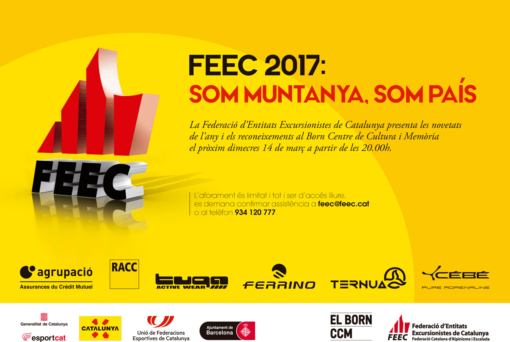 La festa anual de la Federació d’Entitats Excursionistes de Catalunya (FEEC), se celebrarà aquest pròxim dimecres 14 de març al Born Centre de Cultura i Memòria a partir de les 20:00 h, presentada per la coneguda geògrafa i meteoròloga, Míriam Santamaria.
