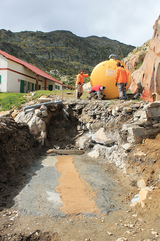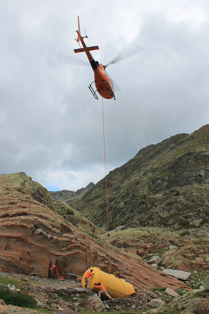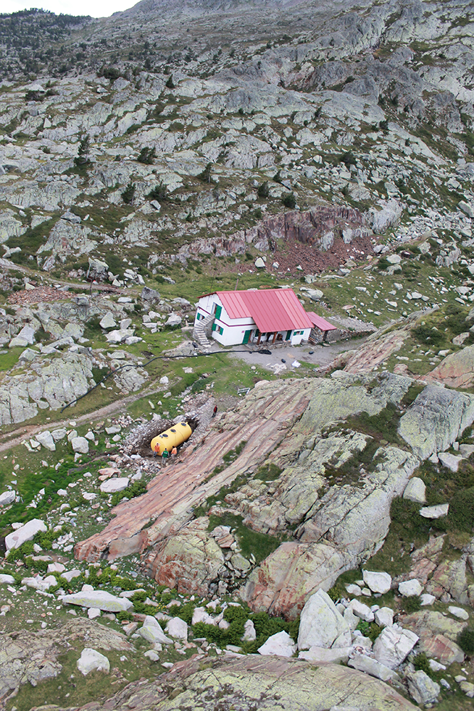 Dimecres 17 de setembre s’han realitzat les maniobres de col·locació en el punt exacte on s’ha d’ubicar la nova fossa sèptica del refugi. L’operació s’ha realitzat amb l’ajuda de mitjans aeris, després que s’hagi hagut de fer un forat força més gran que l’anterior, doncs la nova fossa té un volum superior a l’antiga.