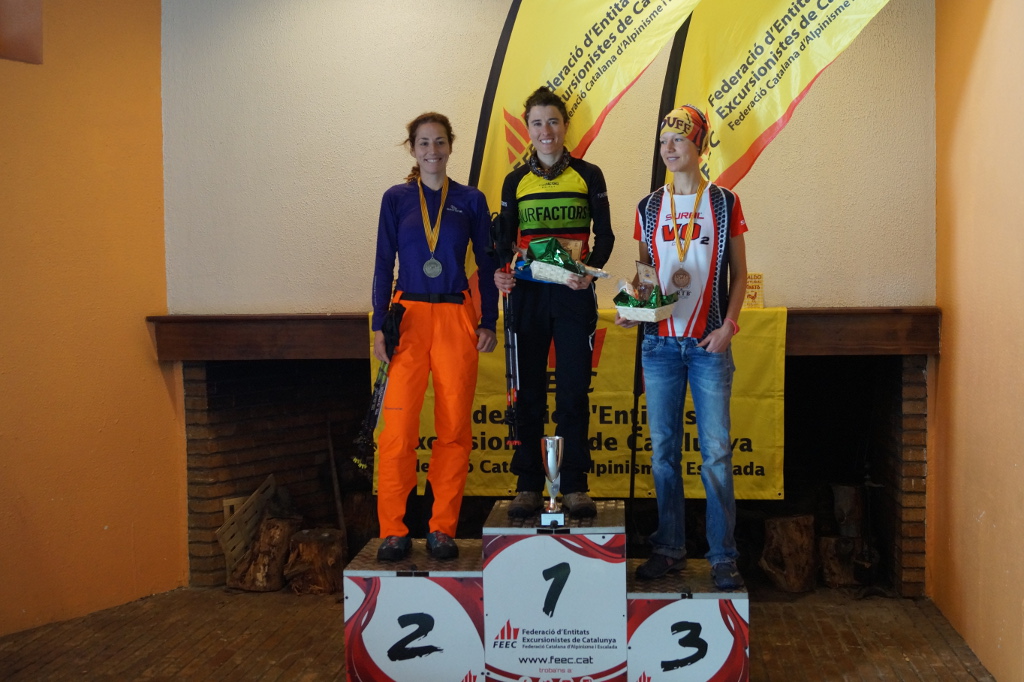 En categoria femenina absoluta, s’ha proclamat campiona de Catalunya Rosa Valls (AE Mountain Runners del Berguedà), també membre de la Selecció Catalana de Raquetes de Neu. Valls ha destacat “que al principi hem sortit lents perquè hi havia molta neu, costava molt avançar. He anat amb la Ragna Debats durant la primera part, i a un tram de bosc hem agafat als nois i ens hem reagrupat. A la baixada la Ragna m’ha passat però a un quilòmetre de meta he començat a esprintar i he pogut arribar primera”. La subcampiona de Catalunya ha sigut Ragna Debats (CEM La Cameta Coixa), també integrant de la selecció. Laia Cuevas (AE Sant Vicenç de Montalt) ha sigut tercera.