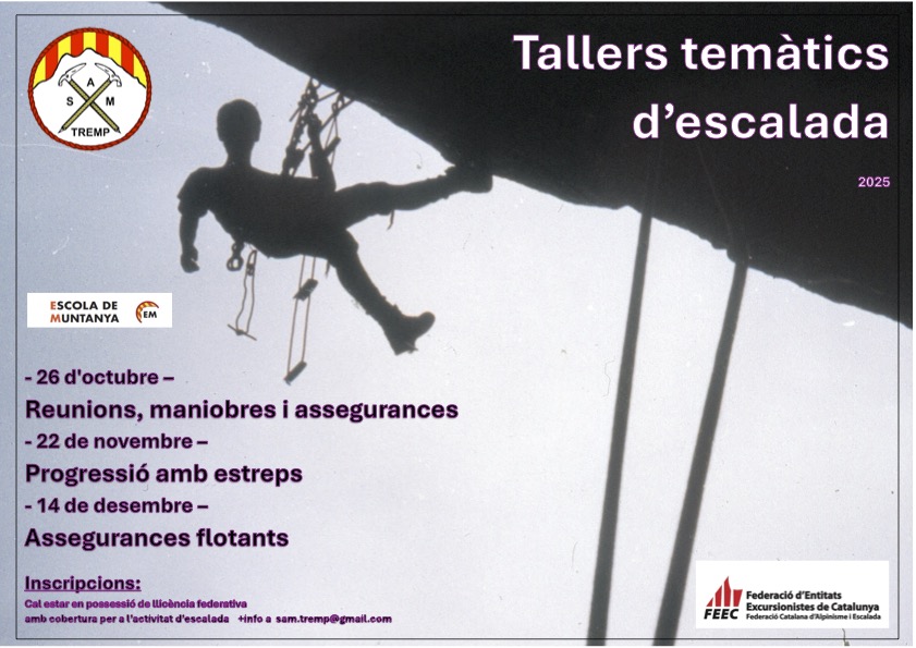 Foto: Jordi Pascual Foto: Jordi Pascual Agenda / Activitats Cicle de tallers temàtics d’escalada Pallars Jussà Alpinisme Alpinisme 26 de d'octubre 2025 - 08:00 / 14 de de desembre 2025 - 20:00 Tremp c/AGBS, sn Preu Federat 40 € Contacte 973651379 sam.tremp@gmail.com Web de l'activitat Inscripcions Tallers monogràfics d’escalada de la SAM-2025, adreçats a practicants habituals de l’escalada en parets naturals. Activitats relacionades 22 de desembre dilluns 2025 Activitats / Alpinisme Escalada esportiva QÜESTIONARI DE SOL·LICITUD PER LES PROVES D’ACCÉS AL CENTRE DE TECNIFICACIÓ D’ALPINISME 2026-28 26 de novembre dimecres 2025 Activitats / Alpinisme Audiovisual “3×4000 a la Vall de Saas (Suïssa). Els meus primers 4000!”