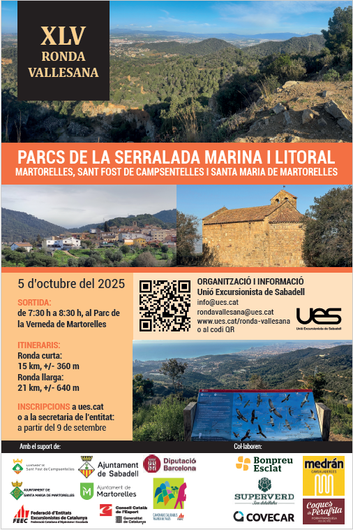 Enguany anirem fins a la Serralada Litoral, concretament, a tres municipis units per la història, el paisatge i la muntanya, Martorelles, Sant Fost de Campsentelles i Santa Maria de Martorelles. Anirem de la vall del riu Besós fins al cap de munt de la Serra de la Conreria, visitarem ermites, antics masos, monuments megalítics, torrents i fonts. Entrarem, encara que lleugerament, als Parc Naturals de Serralada de Marina i el de la Serralada Litoral. El punt més alt del recorregut és el Turó d’en Galceran o d’en Mates, que forma part dels 100 Cims.